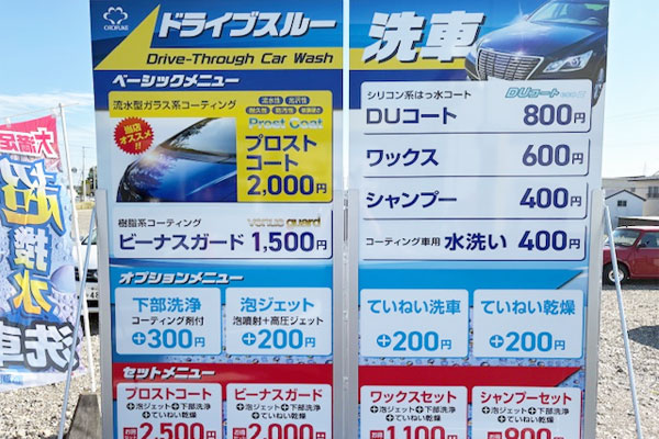 洗車機で手掛けコート同様の効果を実現出来る、流水型ガラス系コーティング「プロストコート」や厚膜化により艶と光沢をアップさせる、樹脂系コーティング「ビーナスガード」など長期間コーティングが持続出来るメニューを取り揃えております。