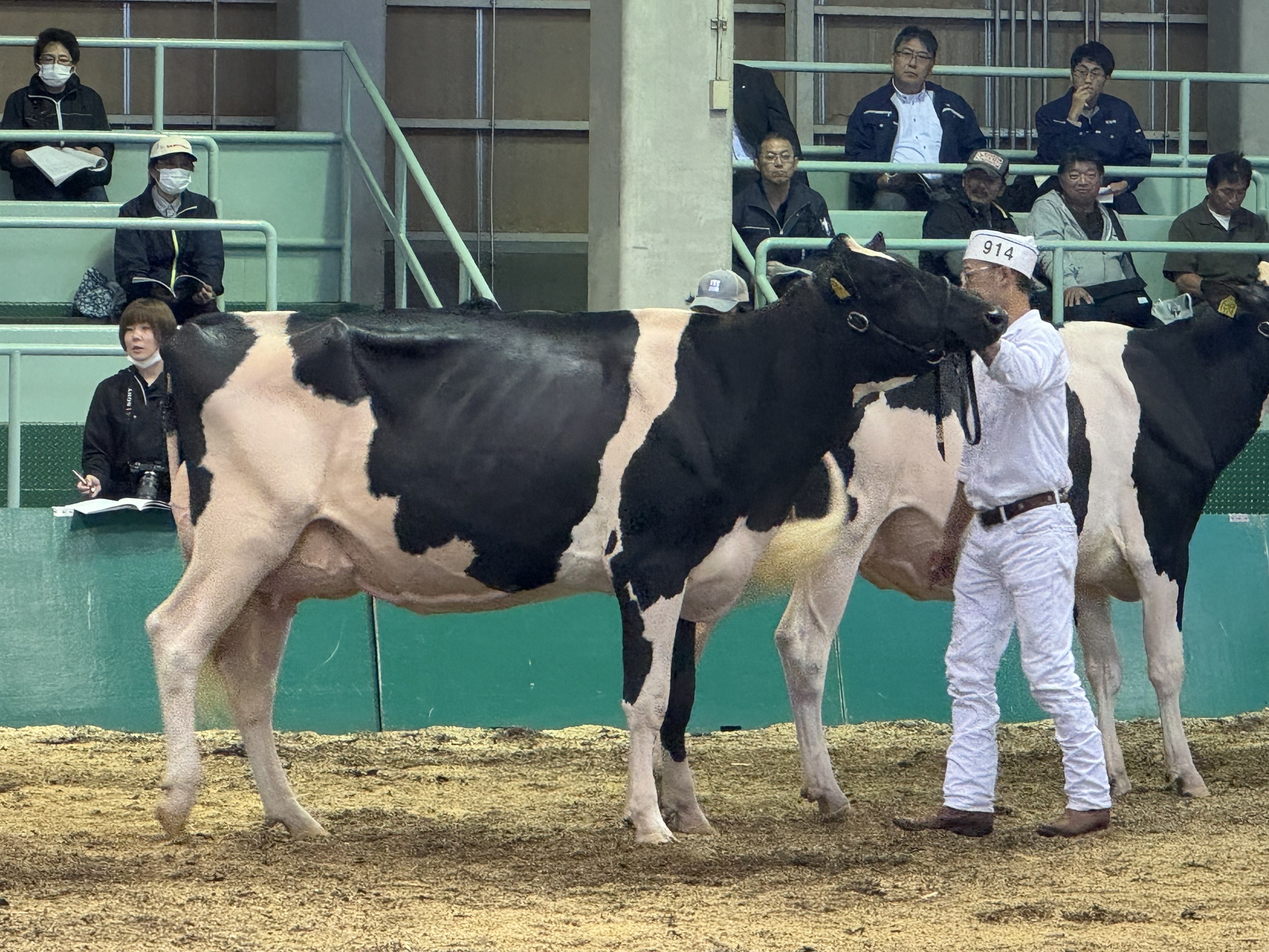 第9部において下牧地区の小原潤哉さん出品「SJフア-ム OK レジ-ナ ライオネル」号(写真)が1等2席に入賞し、令和7年10月25日~26日に開催される第16回全日本ホルスタイン共進会出品牛に選抜されました。