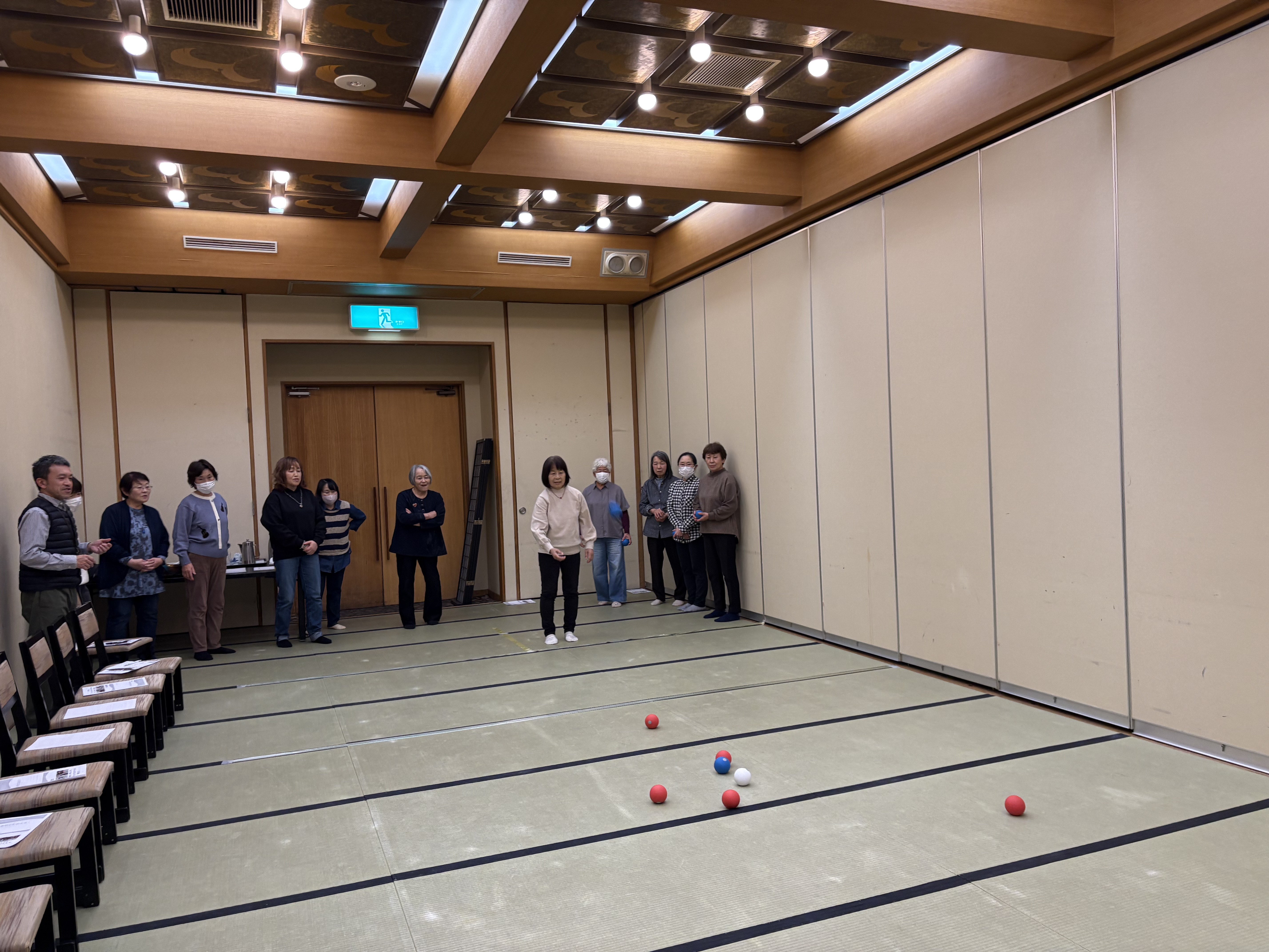 2日目は、音更町社会福祉協議会の佐々木拓也氏にご指導いただき、パラスポーツのひとつである「ボッチャ」を体験しました。初めて体験する競技ということもあり、簡易ルールでゲームを進め、和気あいあいと楽しむ姿が見られました。