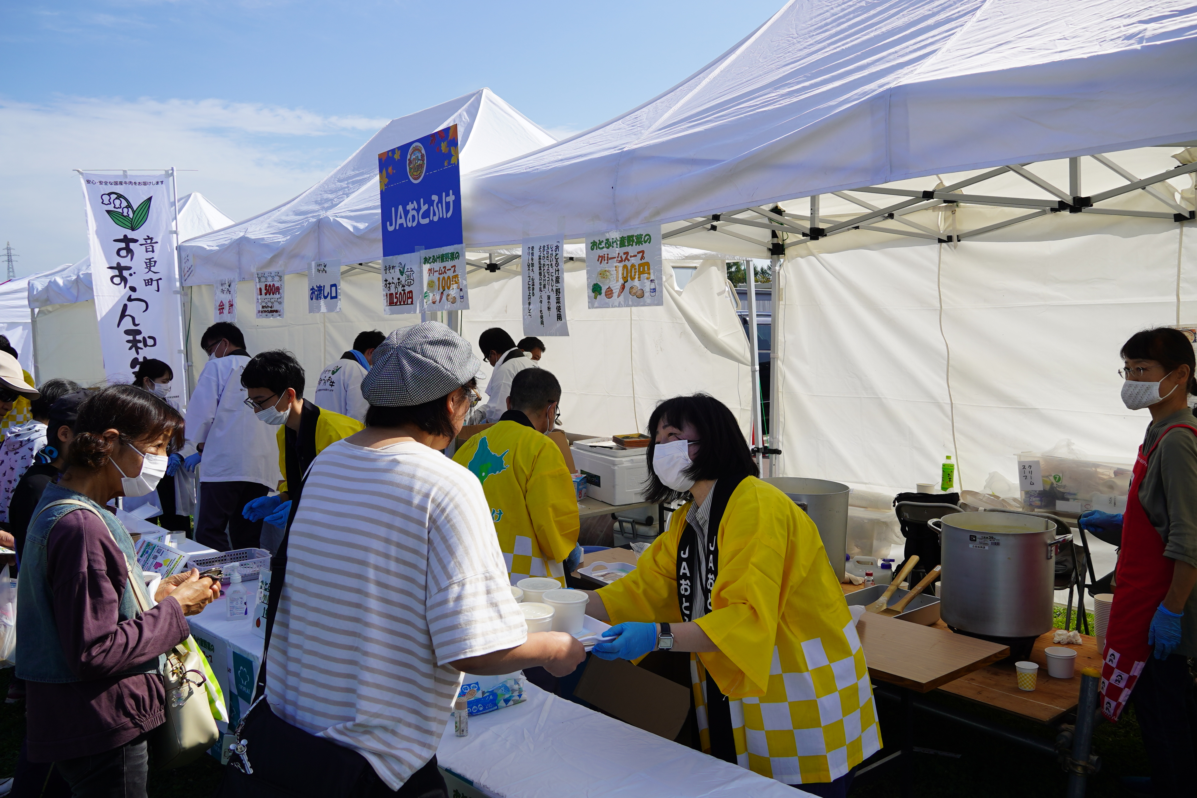 また、音更町産の野菜や牛乳をたっぷり使用した「ミルクスープ」コーナーも大好評でした。具だくさんで栄養満点のスープに、「これだけでお腹いっぱいになるね」「子どもも喜んで食べていました」といった嬉しい感想を多数いただき、こちらも用意した300食を早々に完売しました。