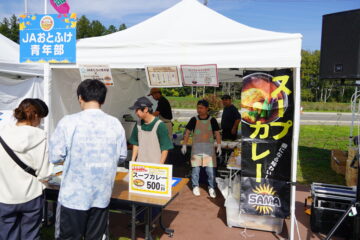 JAおとふけ青年部のブースでは、収穫したての馬鈴しょ、人参、玉ねぎの小袋詰めの他、長芋、南瓜など音更産野菜を販売。開始1時間前から長蛇の列ができ、「地元の野菜を楽しみにしていました!」という声も多く聞かれ、小袋約1,500袋を含め用意した野菜はすべて完売しました。また、飲食ブースでは産地食材をトッピングしたスープカレーを販売し、「野菜がたくさん入っていて美味しい」「野菜の甘みとスープの辛さが最高!」と来場者の心と体をポカポカにしていました。